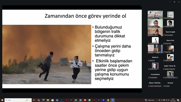 Zoom üzerinden gerçekleştirilen etkinlikte Mustafa Çiftçi, haber fotoğrafçılığının teknik ve etik boyutlarını bizzat tanıklık ettiği kareler üzerinden anlattı. Özellikle savaş, yangın ve doğal afet gibi olağanüstü durumlarda fotoğraf çekmenin zorluklarına değinen Çiftçi, bu anlarda deklanşöre basmanın getirdiği vicdani sorumluluklara dikkat çekti.