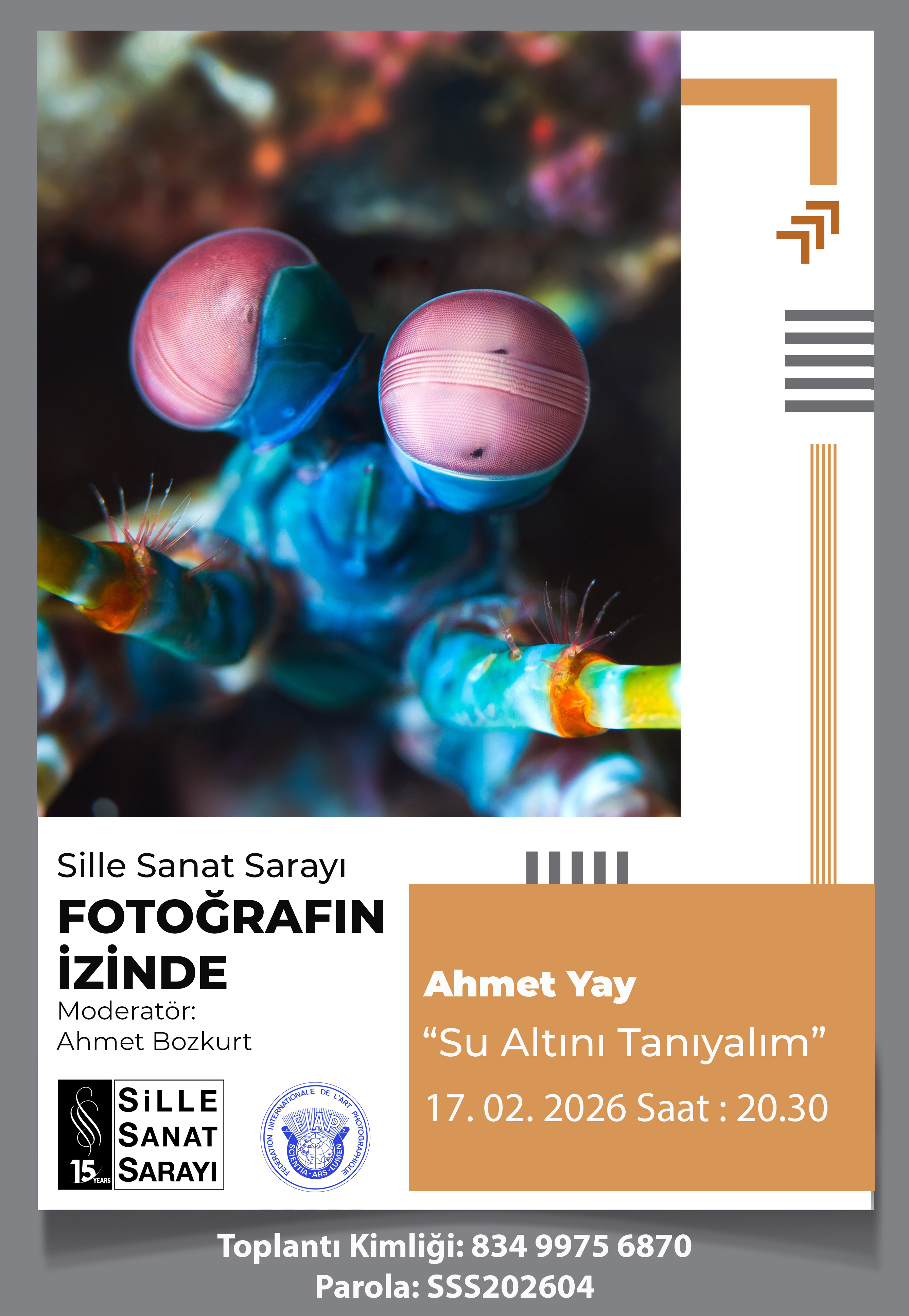 Sille Sanat Sarayı tarafından düzenlenen “Fotoğrafın İzinde” programının konuğu, su altı fotoğrafçısı Ahmet Yay oldu. Çevrimiçi gerçekleştirilen programın moderatörlüğünü ise Sille Sanat Sarayı Onur Üyesi Ahmet Bozkurt üstlendi.