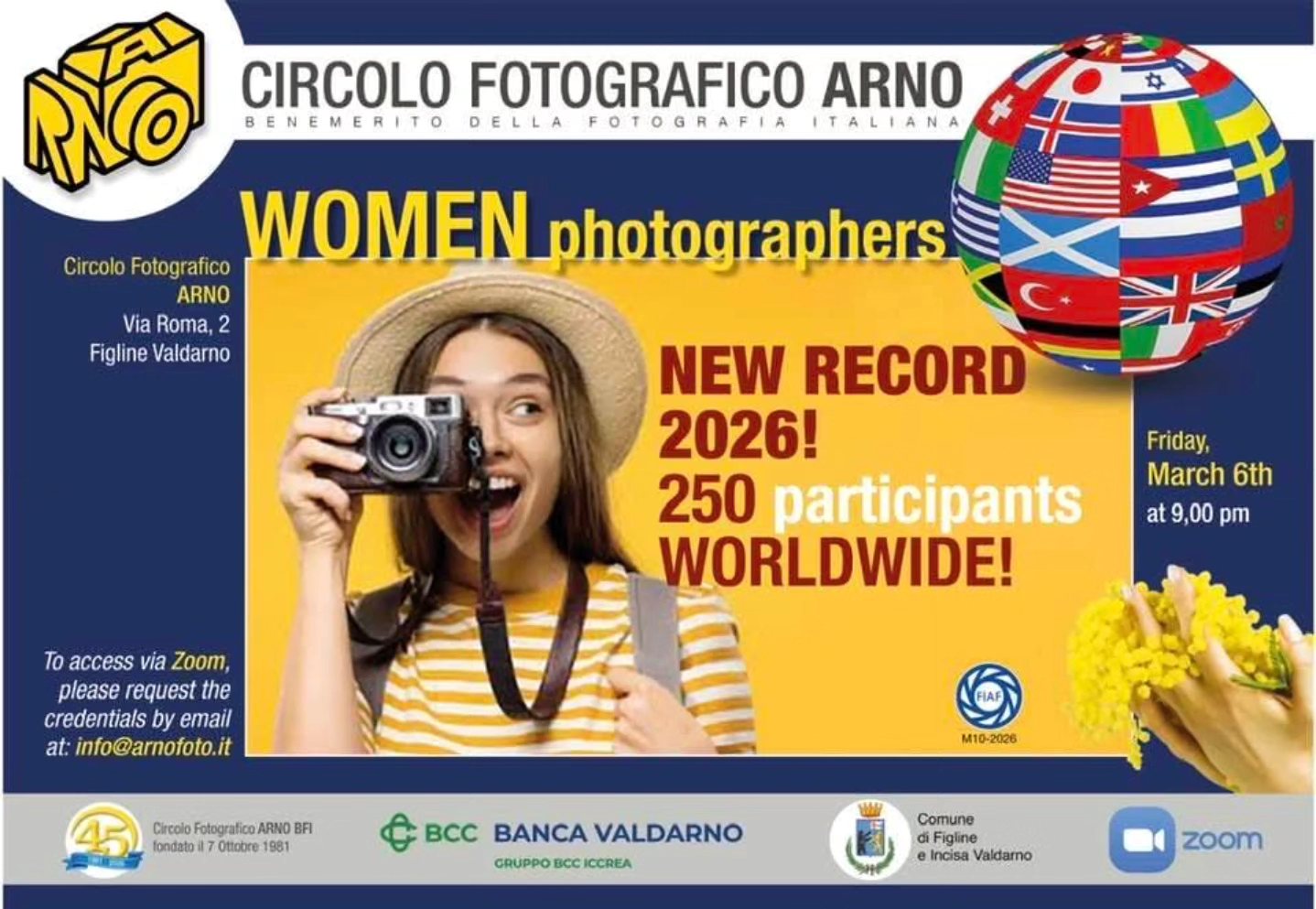 İtalya’da faaliyet gösteren Circolo Fotografico Arno Fotoğraf Derneği tarafından 8 Mart Dünya Kadınlar Günü kapsamında düzenlenen uluslararası fotoğraf sergisinin açılışı gerçekleştirildi. Dünyanın farklı ülkelerinden kadın fotoğrafçıların katılımıyla hazırlanan sergide toplam 250 kadın fotoğrafçının eserleri yer aldı.