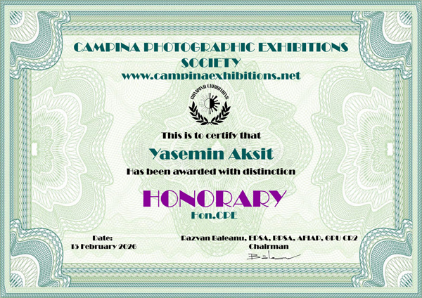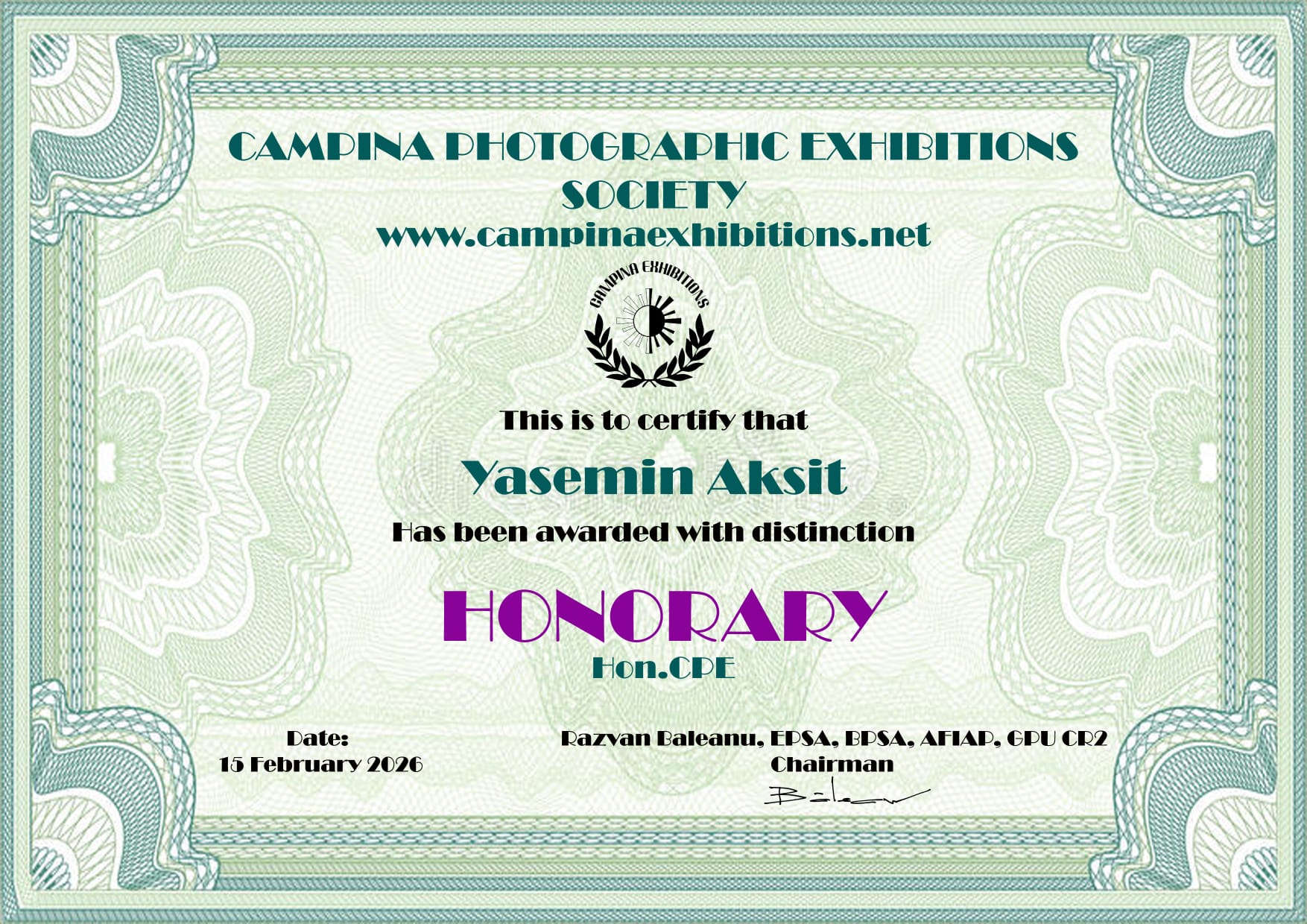 Uluslararası alanda düzenlediği sergiler ve fotoğraf sanatının gelişimine yönelik çalışmalarıyla tanınan Campina Photographic Exhibitions Society, Yasemin Akşit’e bu onursal unvanı, fotoğraf sanatının tanıtımına sunduğu katkılar ve uluslararası sergilere verdiği destek dolayısıyla verdiğini açıkladı.
