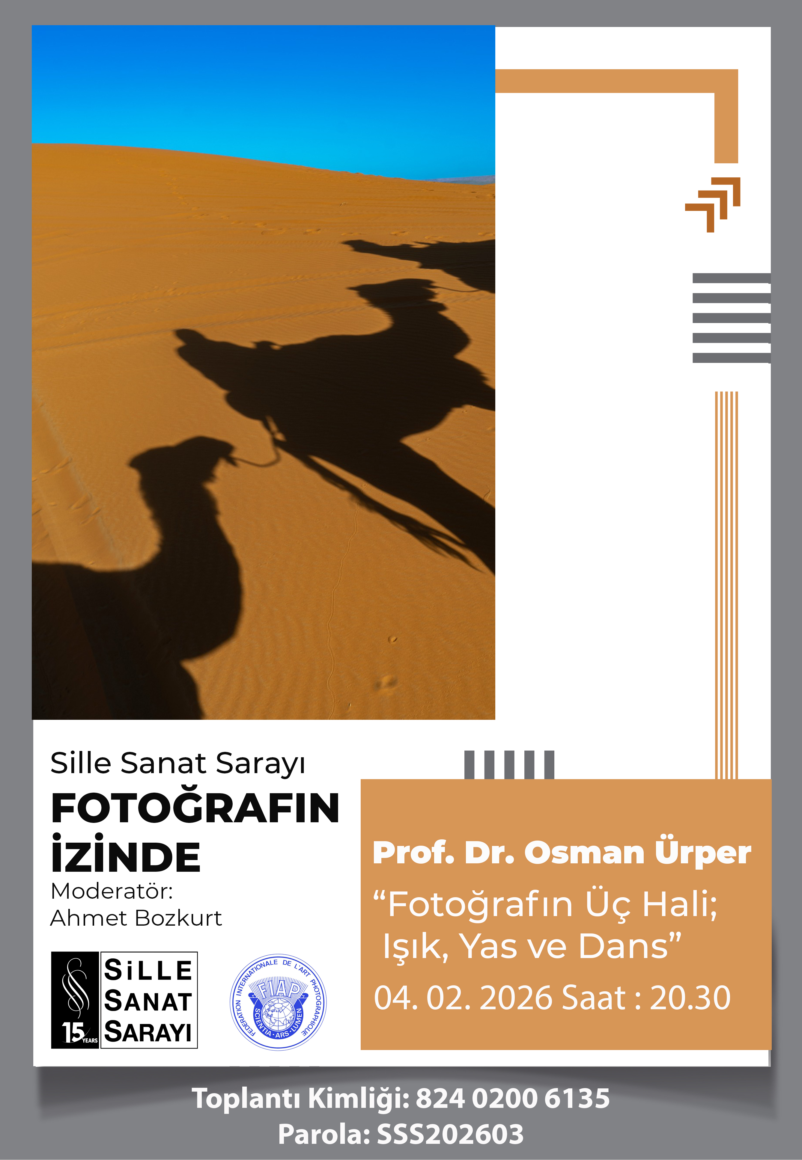 Programın ilk bölümünde yer alan “Sahranın Işığı” başlıklı sunumda, Prof. Dr. Osman Ürper’in Fas’ta çektiği çöl fotoğrafları izleyicilerle buluştu. Bu bölümde, çöl coğrafyasının sert ve yalın yapısı içinde ışık ve gölgenin oluşturduğu görsel ritim, fotoğraf estetiği açısından değerlendirildi. Işığın gün içindeki değişimiyle birlikte ortaya çıkan formlar, izleyicilere çölün zamansız atmosferini yansıttı.